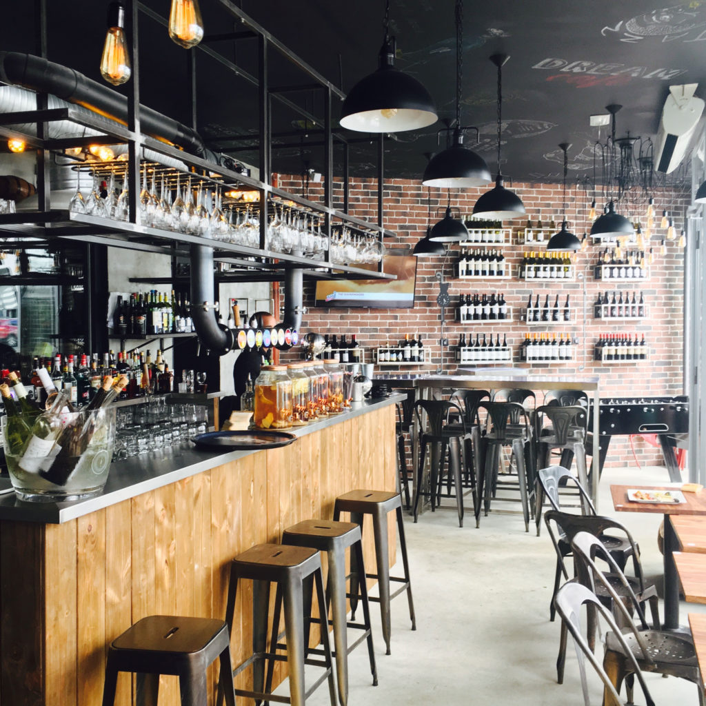 Les différents luminaires sur variateurs participent à l’ambiance du bar et créent différentes zones.